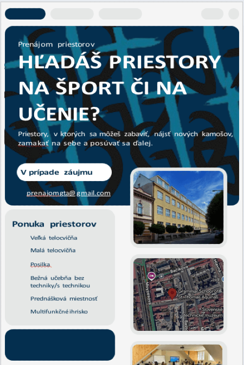 Ponúkame na prenájom priestory: učební, telocviční, posilňovne, ihriska. Pre viac informácií nás prosím kontaktujte mailom.