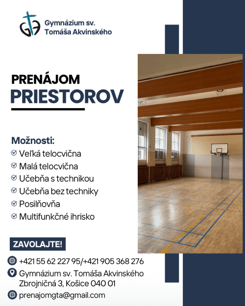 Ponúkame prenájom priestorov na Gymnáziu sv. Tomáša Akvinského v Košiciach, vhodných pre športové kluby, jazykové školy, krúžky, apod. Plagát uvádzame aj v prílohe. K dispozícii: telocvične (veľká aj malá) učebne (s technikou / bez) posilňovňa multifunkčné ihrisko V prípade záujmu nás neváhajte kontaktovať: 📞 +421 55 62 227 95 / +421 905 368 276 📧 prenajomgta@gmail.com